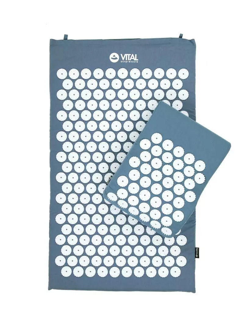 Zestaw do akupresury VITAL składający się z maty, poduszki i pokrowca. Akupresura to dziedzina wywodząca się z tradycyjnej medycyny chińskiej. Regularne stosowanie maty do akupresury wpływa korzystnie na minimalizowanie poziomu stresu, bólu szyi, pleców, głowy, bólów stawowych. Zmniejsza napięcie w ciele, pomaga przy zapaleniu rwy kulszowej, pomaga przy chronicznym zmęczeniu, zaburzeniach snu czy problemach trawiennych. Wystarczy 10 minut leżenia na macie, aby zauważyć zmiany np. rozgrzanie tych części ciała, w których nastąpiła poprawa cyrkulacji krwi.