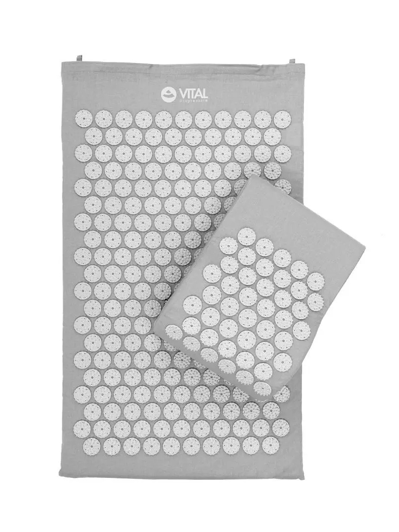 Zestaw do akupresury VITAL składający się z maty, poduszki i pokrowca. Akupresura to dziedzina wywodząca się z tradycyjnej medycyny chińskiej. Regularne stosowanie maty wpływa korzystnie na minimalizowanie poziomu stresu, bólu szyi, pleców, głowy, bólów stawowych. Zmniejsza napięcie w ciele, pomaga przy zapaleniu rwy kulszowej, pomaga przy chronicznym zmęczeniu, zaburzeniach snu czy problemach trawiennych. Wystarczy 10 minut leżenia na macie do akupresury, aby zauważyć zmiany np. rozgrzanie tych części ciała, w których nastąpiła poprawa cyrkulacji krwi.
