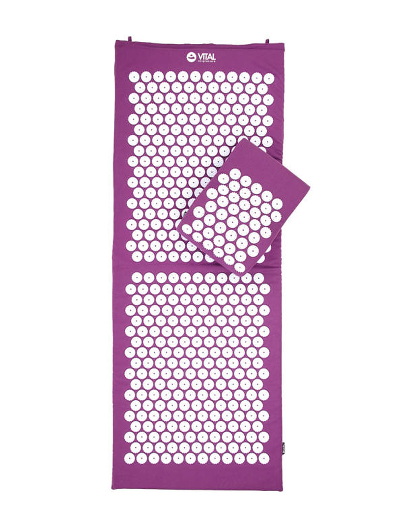 Zestaw do akupresury VITAL XL składający się z maty XL, poduszki i pokrowca. Akupresura to dziedzina wywodząca się z tradycyjnej medycyny chińskiej. Regularne stosowanie maty wpływa korzystnie na minimalizowanie poziomu stresu, bólu szyi, pleców, głowy, bólów stawowych. Zmniejsza napięcie w ciele, pomaga przy zapaleniu rwy kulszowej, pomaga przy chronicznym zmęczeniu, zaburzeniach snu czy problemach trawiennych. Wystarczy 10 minut leżenia na macie, aby zauważyć zmiany np. rozgrzanie tych części ciała, w których nastąpiła poprawa cyrkulacji krwi.